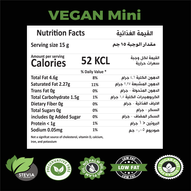 المكونات: ستيفيا – زيت جوز الهند – بودرة الكاكاو – بودرة حليب جوز الهند – بندق طبيعي – ليسيثين الصويا E322 – فانيلين – ملح طعام.