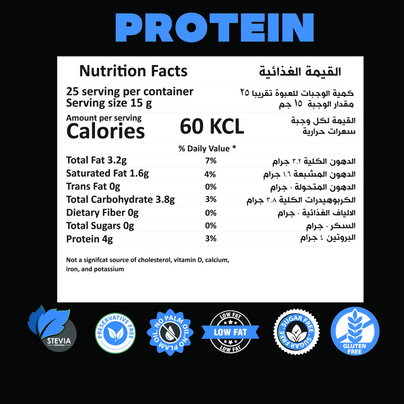 المكونات: ستيفيا – زيت جوز الهند – بودرة الكاكاو – بروتين أيزوليت – بودرة الحليب – بودرة مصل الحليب – بندق طبيعي – ليسيثين الصويا -E322 فانيلين – ملح طعام.